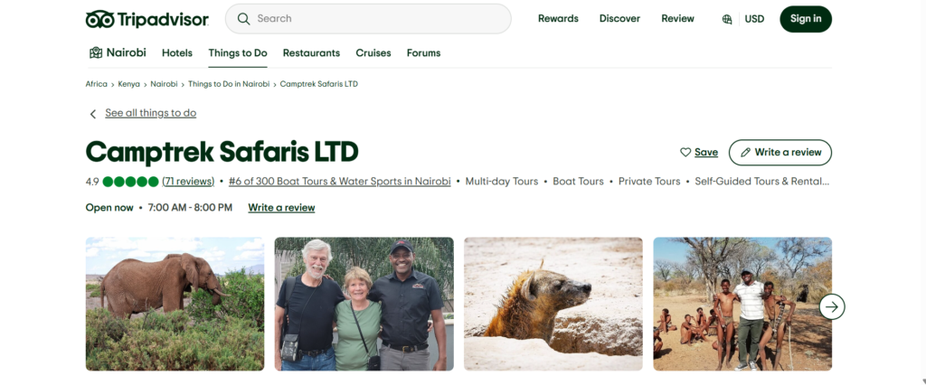 Example: Checking reviews for Camptrek Safaris shows consistently positive feedback: